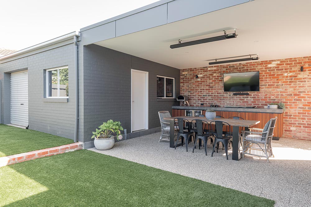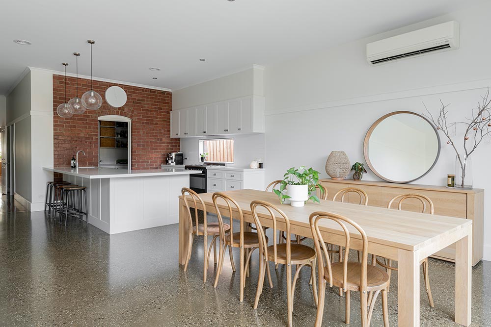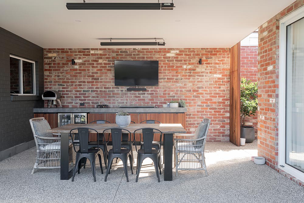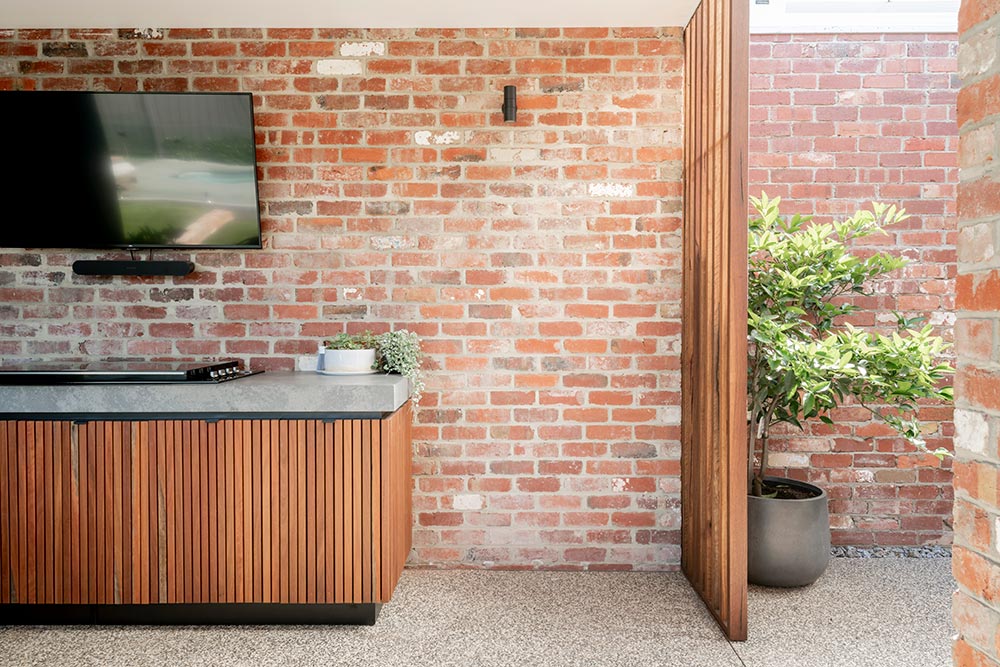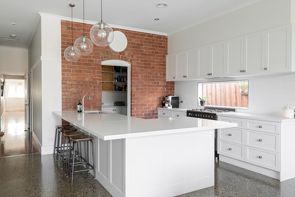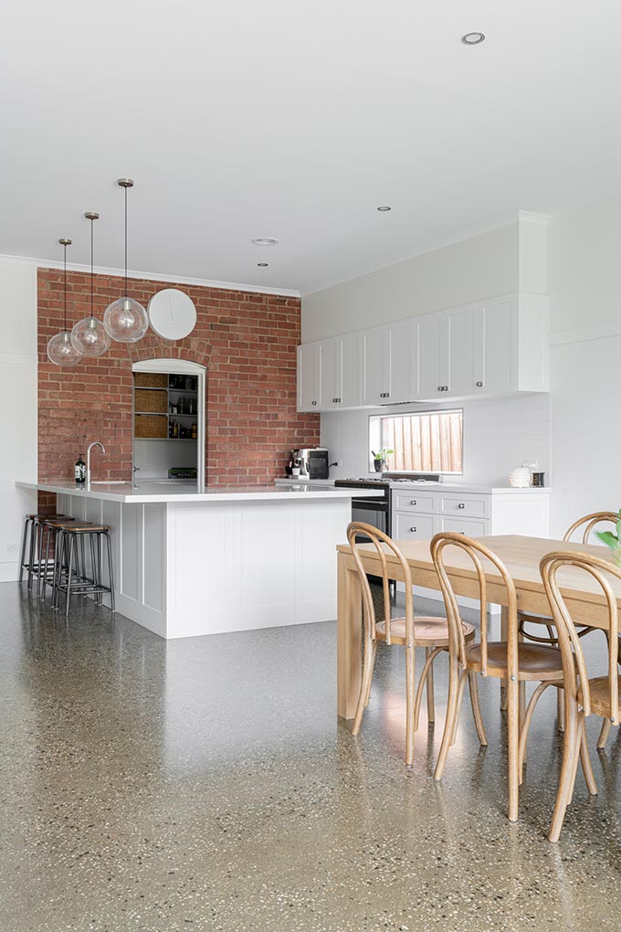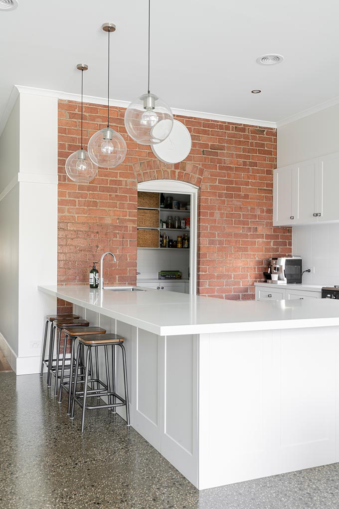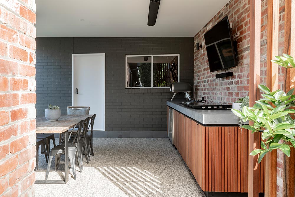 When you enter this area the first thing you’ll notice is the recycled bricks, the eclectic nature of these bricks gives the overall feel and character of industrial architecture. The warmth of the timber cladding on the external kitchenette cabinetry blends beautifully with the bricks. The concrete benchtop on the kitchenette continues the industrial flavour. The new all white kitchen allows the recycled brick feature wall to exude its charm.